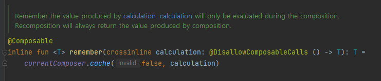 Composer 의 확장함수이며, 말 그대로 캐시 기능입니다. Composition 내부의 데이터를 기억할 수 있도록 합니다. 이는 remember 를 위해 사용됩니다.
