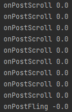 Column 내의 LazyColumn 에서 스크롤을 수행하였을 때의 콘솔입니다. LazyColumn 의 끝에 도달하지 않으면, onPostScroll 과 onPostFling 은 계속 0.0, -0.0 입니다. 그 이유는 간단한데, LazyColumn 에서 시작된 스크롤을 LazyColumn 내부에서 모두 소비했기 때문에, 스크린 Column 에 Dispatch 된 ScrollAmount(Available Velocity, Offset) 는 0.0 일 수 밖에 없습니다.