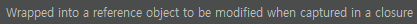 Closure 내에서 Capture 되었을 때 해당 변수가 Modified 되기 위해 Reference object 로 감싸졌다는, 다소 이해하기 어려운 설명을 볼 수 있습니다.