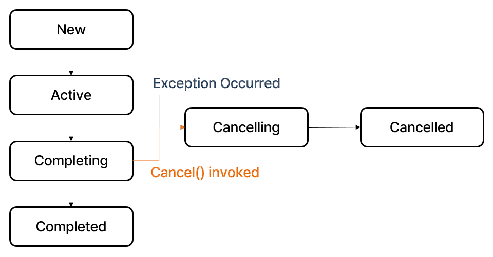 코루틴을 취소시키기 위해서는 cancel() 메서드를 사용하는데, cancel() 메서드는 해당 코루틴을 cancelling 상태로 만들며, 이 자체로 코루틴이 수행하던 작업이 취소되지는 않습니다.