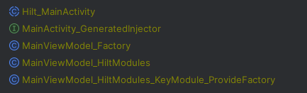 Hilt 는 외부에서 의존성을 주입해줄 수 있도록 보일러 플레이트 코드가 Generate 되어, 이를 기반으로 DI 를 수행하는 방식으로 작동합니다. 우리는 @HiltViewModel 어노테이션을 붙여 생성한 ViewModel 클래스에 의해 Generate 되는 MainViewModel_HiltModules.java 클래스를 확인할 수 있습니다.