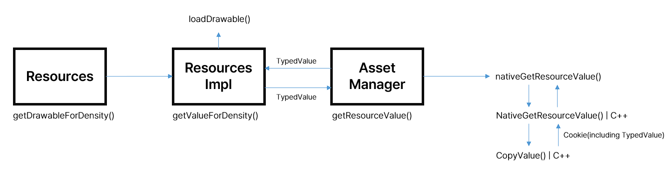 TypedValue 는 얻어 온 Drawable 의 반환을 위해 사용되는 컨테이너 클래스입니다. 우리가 주목해야 할 부분은 ResourcesImpl 클래스인데요. 실질적으로 내부 리소스에 접근하는 클래스이며, 해당 클래스 최상단 주석에는 'Resources is just a thing wrapper around this class.' 라는 내용이 작성되어있을 만큼, 리소스 접근에 핵심적인 역할을 수행하는 클래스입니다.