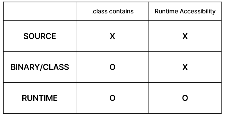 Annotation 의 정보가 컴파일 후에 얼마나 오래 유지되어야 하는지를 나타내는 것으로, 다음과 같은 세 가지 주요 값이 있습니다.