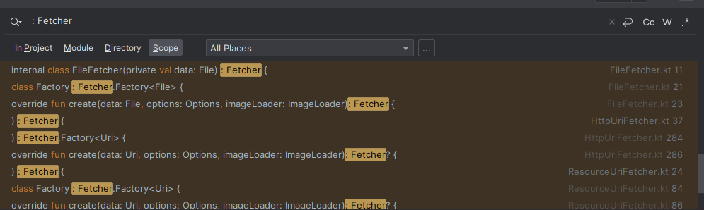 fetch() 메서드는 Fetcher 의 메서드이므로, Fetcher 를 구현하는 구현체를 찾습니다. 다양한 구현체가 검색되었지만, 보통은 네트워크에서 이미지를 얻어 오는 것에 익숙하니, HttpUriFetcher 를 살펴보면 될 것 같습니다.