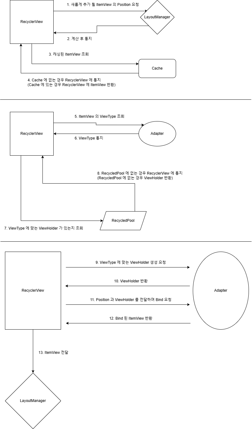 간단하게 표현하고 싶었으나, 과정이 워낙 복잡하고 길었습니다. LayoutManager 를 통해 필요한 Position 을 찾고 이에 대한 ViewHolder 를 획득한 뒤, Adapter 에 획득한 Position 과 ViewHolder 를 전달하여 항목을 바인딩, 바인딩된 ItemView 를 다시 LayoutManager 에게 전달하여 RecyclerView 에 표시하게 됩니다.