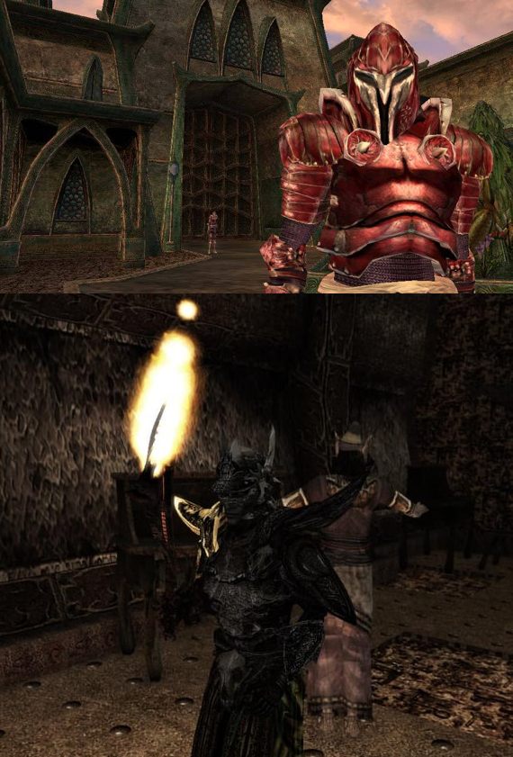 과도기에 있었던 작품들의 경우, 물리적 반사의 가능성을 엿볼 수 있는데요. 엘더스크롤3 모로윈드의 경우 2002년에 출시된 작품이고, 여전히 전통적 셰이딩 방식을 사용했지만, 물체의 각 정점에서 빛의 강도를 계산하고 그 사이를 보간하여, 광원에 대한 이해를 플레이어에게 전달할 수 있었습니다. 어두운 공간에 등불이 있거나 횃불을 꺼내들면 주위가 밝아지는게 대표적인 예시입니다.