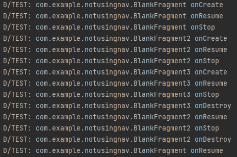 먼저, Transaction 에 addToBackStack() 을 호출하지 않았을 경우입니다. 각 Transaction 을 수행할 때마다, 기존에 있던 Fragment 가 onDestroy() 됩니다. 이렇게 구현하면, BlankFragment 나 BlankFragment2 를 다시 호출했을 때 수명주기를 처음부터 다시 타기 때문에, 구현에 따라 객체 생성이나 통신 등이 진행되면서 UX 를 해칠 우려가 있습니다.