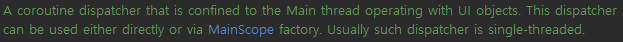Main 은 UI와 상호작용하는 작업에 사용하도록 권고되고 있습니다. UI 관련 작업은 MainThread 에서 수행되어야 하기 때문이죠. 해당 Dispatcher 를 이용하는 코루틴은 MainThread 에 탑재되어 작업을 수행합니다.