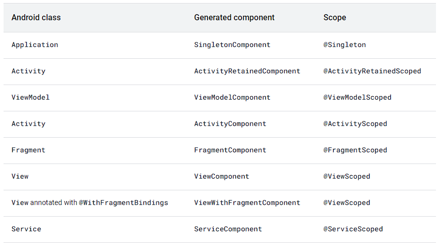 Hilt 에는 수많은 스코프 가 있습니다. 스코프의 존재 이유는 외부에서 생성되어 주입되는 인스턴스가 안드로이드 컨테이너의 생명주기에 따라 자동적으로 생성 및 해제되도록 하기 위해서입니다. 제 때 생성되지 않아 문제가 생기는 경우나, 해제되지 않아 지속적으로 메모리가 낭비되는 상황을 방지하기 위해서지요.